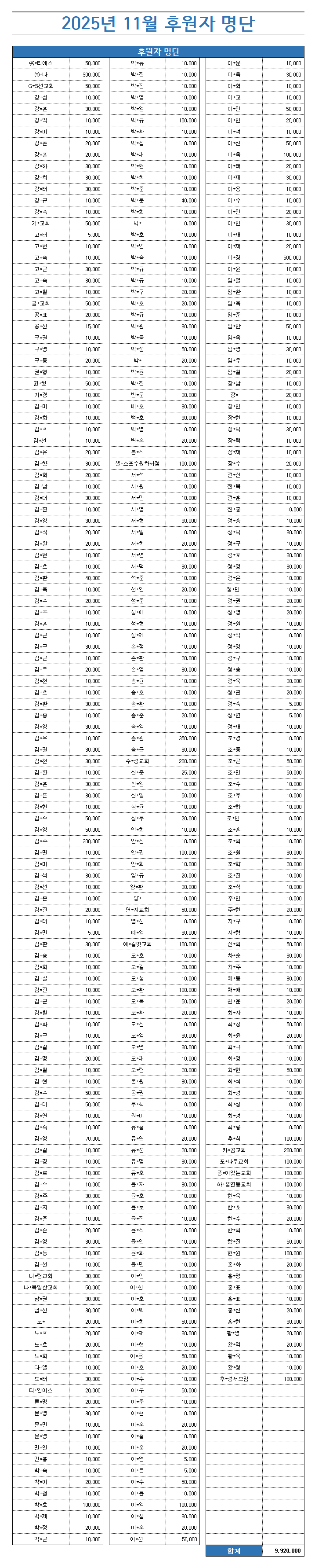 2025년 11월 후원현황 2025년 12월 19일 📁 후원현황 2025년 11월 후원 현황입니다. 소중한 후원에 깊이 감사드립니다. * 지출내역은 공지사항 게시판의 연간보고서를 통해 연간 단위로 확인하실 수 있습니다. 조회수 : 490 ← 이전 글 2025년 기부금 영수증 발급 안내 📋 목록보기 후원현황
